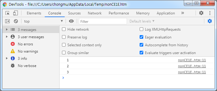 간단하죠? 배열에 들어가 있는 값인 1, 2, 3을 확인해봤습니다.