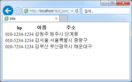 간단하게 스크립트소스를 설명하자면 tbody태그내에 존재하지 않는 tr td를 동적으로 생성하고 td태그사이에 json에서 가져온 데이터를 json key를 통해서 value찾아 배치(append)하였습니다.